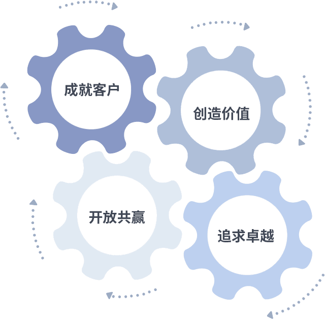成就客户是一切决策的出发点,,创造价值是衡量所有工作的标准,,,,追求卓越是我们做事做人的态度,,,开放共赢是我们的格局也是最终的结果。。价值观的齿轮环环相扣,,,,推动着组织里的每个人不断向前。。。